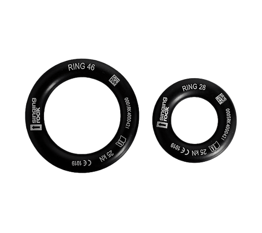 Anillos de reparto de carga diseñados para protección contra caídas, utilizados por una sola persona en trabajos en altura y actividades de montañismo. Su diseño compacto y resistente permite una distribución uniforme de la carga, contribuyendo a una mayor seguridad y estabilidad del sistema de anclaje.
